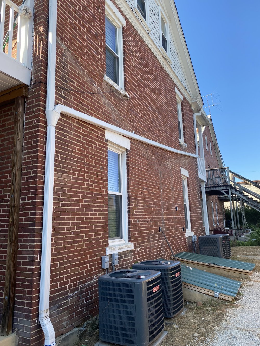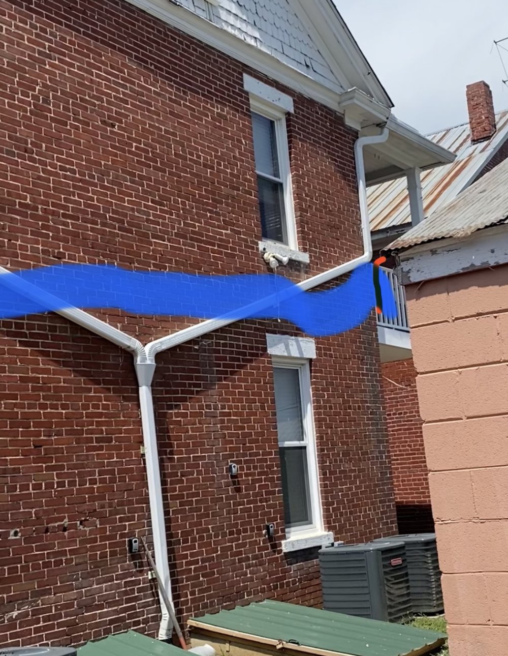 The old downspout arrangement was centered but flowed into a