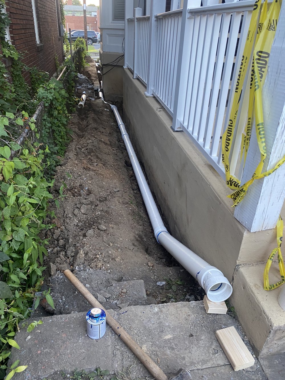 The new drainage is out to the street in front of the house. So a trench had to be dug for new PVC pipe.