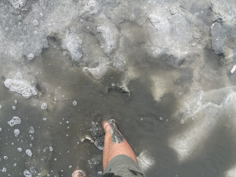 When Bob finally arrived he tried to wade in but never got past mud and it smelled terrible. After sinking up to his knees he decided it was not safe or worth it.