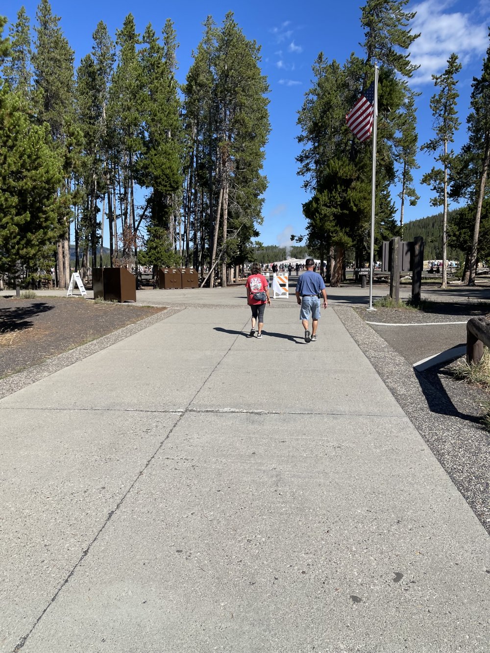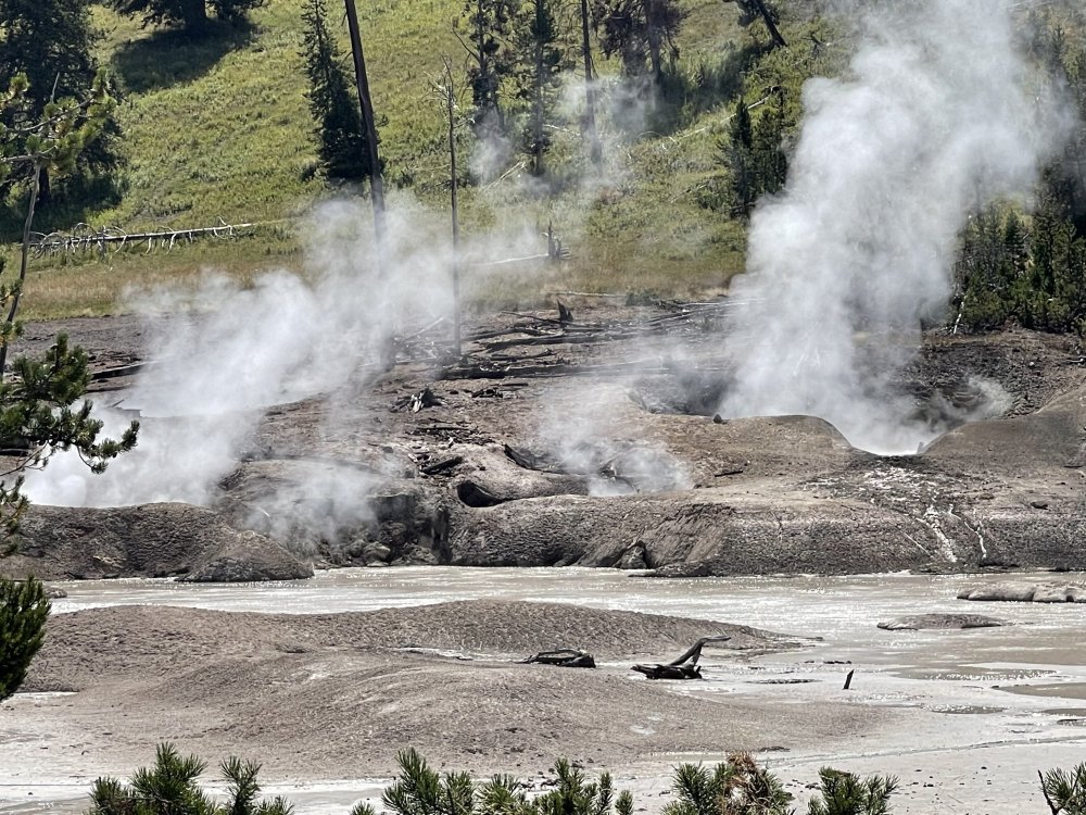 The route to Yellowstone ran past a view of the Grand Tetan Mountains and then once we entered Yellowstone park the path to Old Faithfull had many roads still under